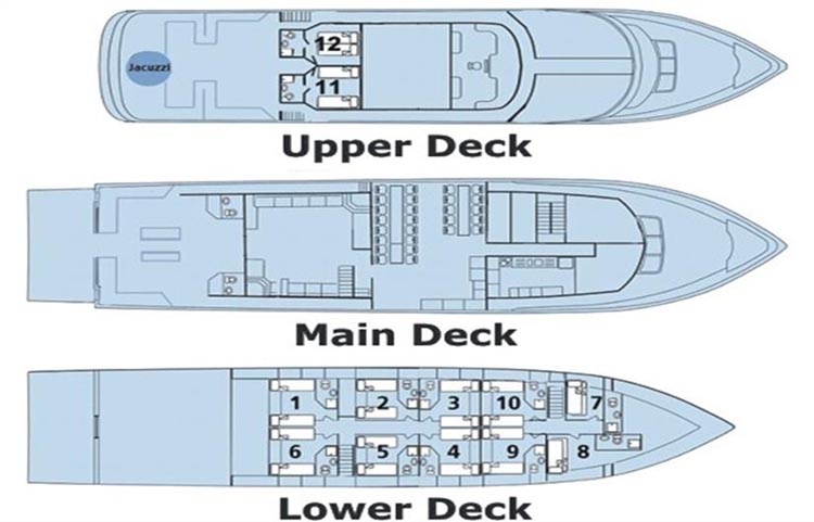 The First Vessel In a Quality FleetBlue Fin offers Luxury Double Suites and Twin Cabins with Mini Refrigerators and Personal Entertainment Systems as well as 100% En-Suite facilities. She caters well for NITROX divers and Re-Breathers.