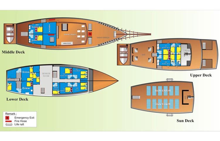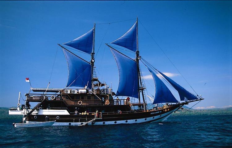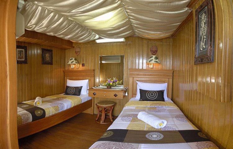Sea Safari VI accomodates 20 guests in 10 air conditioned En-Suite cabins. She is 34m long and 10m beam so even with a full complement of 20 she doesn't feel crowded. Designed as a traditional Buginese Phinisi Schooner she is constructed from Ulin wood.