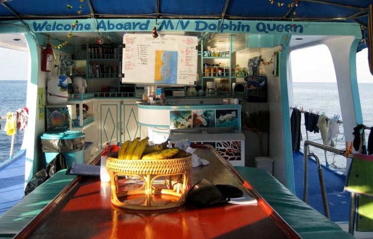 The 1st dive is at 7am. Dive time is 55 min followed by a 5 min safety stop. On the majority of dives you will be picked up by the Dolphin Queen or the inflatable tender. This makes for easy, stress free diving. There is a limit of 4 divers to 1 dive guide. There is a 3hr surface interval for exploring beaches, reading, relaxing on the sundeck or in your cabin as you wish.